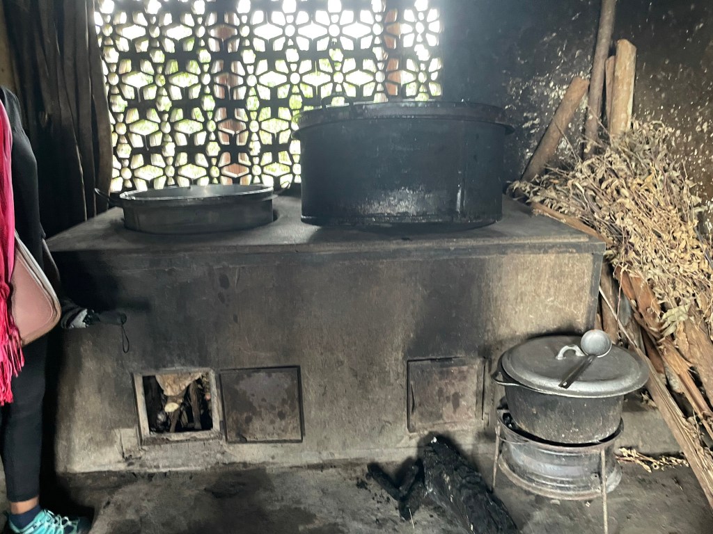 We venture over to the kitchen to review how it’s functioning. If you have met with school leadership in Uganda, then you’ve inevitably heard that their kitchen has smoke issues. These schools almost exclusively cook posho and beans in huge saucepans over wood fires for hours every day inside an enclosed brick building with a few small windows. The wood-fired stoves have open doors to put the firewood in, but these doors often stay open for a few reasons. First, the firewood is not chopped small enough to fit all the way into the stove. Instead, they just slide the wood logs in slowly as necessary to keep the fire burning. Secondly this keeps the air flowing and the fire burning. There are often smoke stacks at the back that do very little to filter the smoke away. This one is no different, black char covers the walls. The high ceiling and metal sheets that should be reflecting daylight back at you don’t. It’s no longer daytime inside and you can barely breathe. Hattie asks a few questions of the cooks to see how they use the kitchen. I catch various forms of the Luganda word for cooking and not much else. As we circle the building, we see indeed more smoke coming from the windows than the chimney pipes. Kids gather around the overhangs of the kitchen, hoping to shelter a bit from the light rain falling down. Our site research complete, we tell the EWCV team that we can move on to the next task.